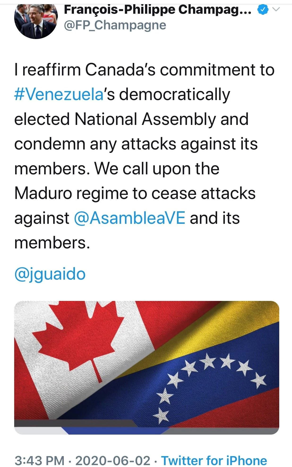 On the same day of his moment of silence on Trump, Trudeau’s Foreign Minister Jean-François Champagne issued a statement via Twitter confirming Canada’s support for the violent pro-U.S. opposition in Venezuela against the elected Maduro government.